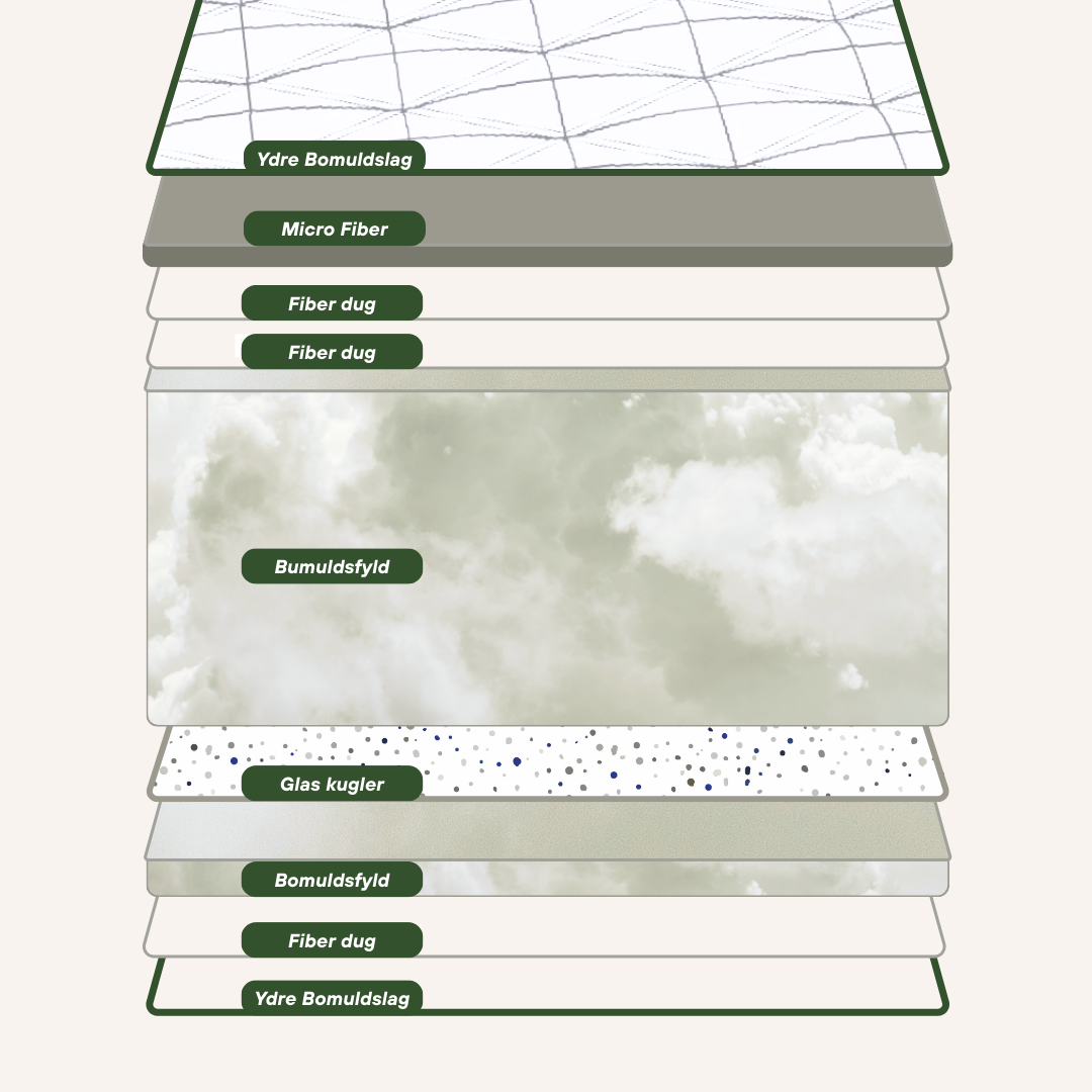 Tyngdedynen måler 135 × 220 cm eller 135 x 200 cm og har en totalvægt på enten 5 kg, 7 kg eller 9 kg. Den består af et blødt yderlag og en fyldning af mikrofiber og glaskugler, som sikrer en jævn og behagelig vægtfordeling. Dynen har en quiltet struktur, der holder fyldet på plads og forhindrer klumper. Den leveres i en klassisk hvid farve og kan maskinvaskes ved lav temperatur. Vi anbefaler, at den lufttørres eller tørretumbles ved meget lav varme for at bevare holdbarheden bedst muligt.
