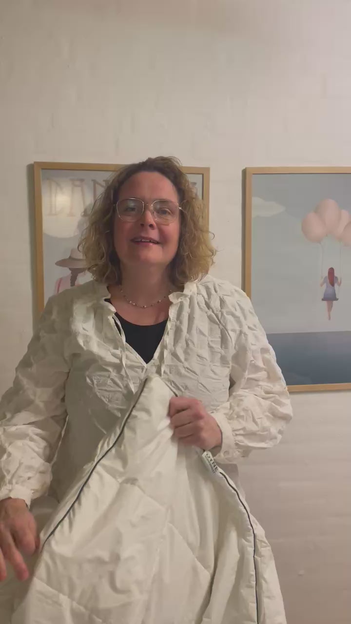 Dynens vægt er fordelt jævnt i faste felter, så den ligger roligt og stabilt over kroppen. Det giver en blid, omsluttende fornemmelse, som hjælper kroppen med at finde ro og falde hurtigere til afslapning. Du mærker vægten – men uden at dynen føles tung, stiv eller trykkende.